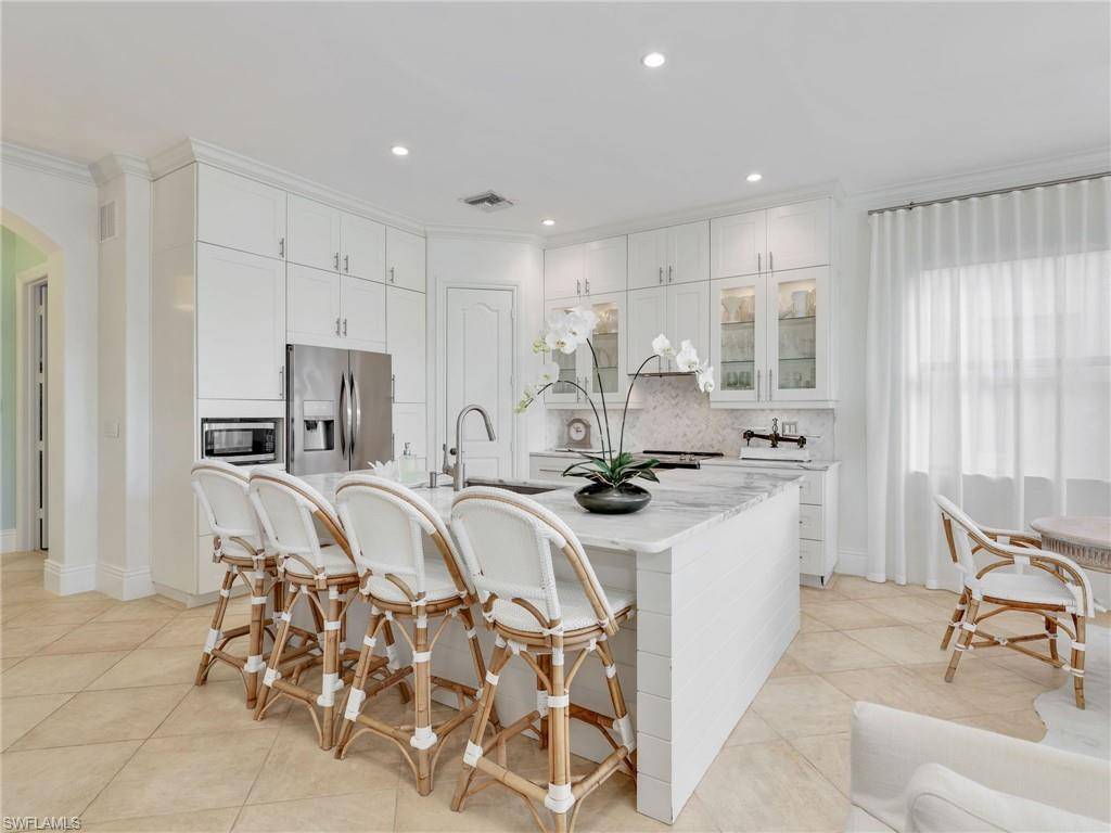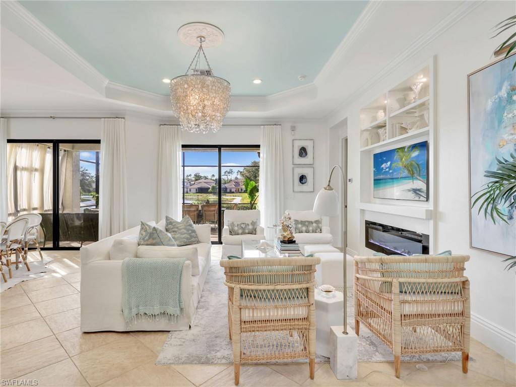 Welcome to 1365 Serrano Circle in beautiful and sought after Andalucia in Naples, Florida! This gorgeous, renovated Lakefront home features 3 bedrooms plus a Den, 2.5 baths with a main level Master/Primary bedroom. This tranquil home offers the perfect blend of luxury, relaxation and convenience. You will love the open-concept floor plan that creates effortless flow between the living, dining, and kitchen areas—ideal for both everyday living and entertaining. The renovated kitchen is a standout center piece of the home featuring newer modern cabinets, stunning marble counters, lighted glass cabinetry to the ceiling, a ship-lapped kitchen island and stainless steel appliances. The living room features a trey ceiling and custom built in entertainment unit with an electric fireplace and the living room then opens to a screened lanai overlooking the lake featuring beautiful sunsets almost daily. It is a relaxing retreat with an outdoor kitchen with built-in grill and wine cooler - perfect for morning coffee, evening cocktails, or dining and entertaining. The Master/Primary on Main - also with access to the lanai - is spacious with double closets, hardwood floors and a spa-like bath with two separate vanities, soaking tub and separate shower. Additional features are impact windows and doors, 2 newer HVAC systems with air filtration systems, new lighting, fresh interior paint, custom window treatments, new flooring and more. You will love the easy access to 75, shopping, restaurants, a local hospital, being out of flood zone and in a sought after school zone - Barren Collier HS. This amazing home is designed by an accomplished and Wall Street Journal published interior designer and some furnishings are available for purchase outside of contract. The home is ideally positioned directly across from the community pool, hot tub and clubhouse, giving you amenities just steps from your front door all while being 15 minutes to downtown Naples and close to dining, beaches, golf, and everything Naples has to offer. This home is the ONE to see and is perfect as a primary residence or seasonal home.