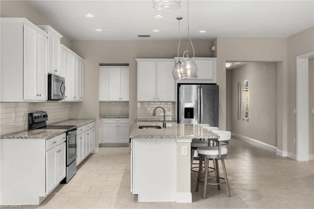 The gourmet kitchen is the heart of the home, complete with a large center island, stainless-steel appliances, sleek cabinetry, and abundant storage—perfect for both everyday meals and entertaining.
